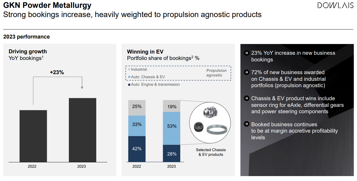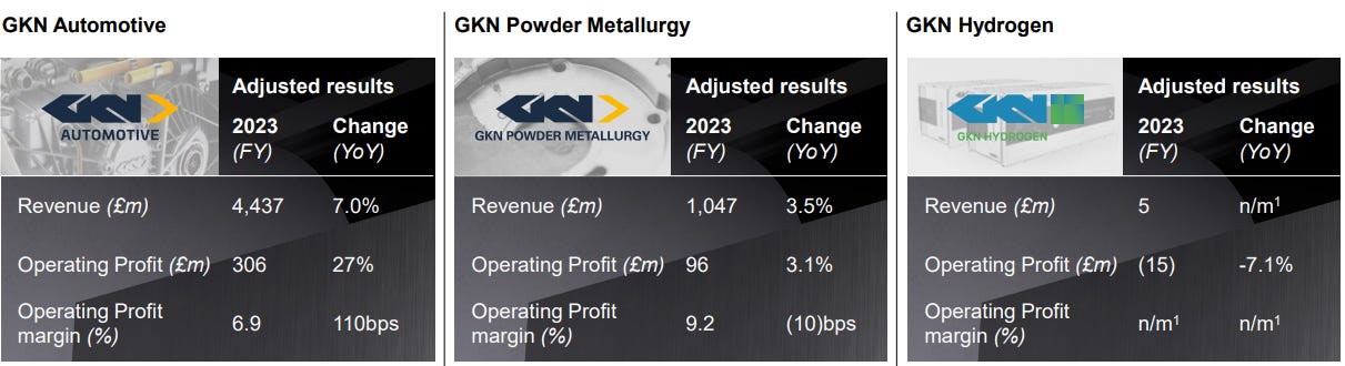 Dowlais' sales are divided into three segments: automotive, powder metallurgy, and a residual hydrogen storage business with revenue of only 5 million pounds.