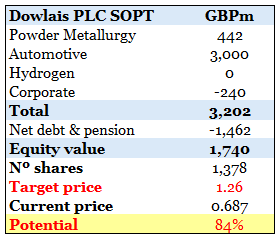 El entreprise value de Dowlais actualmente es de £2.400m, y si excluimos la división de Podwer Metallurgy con una valoración de 0.5x Price to book (el valor en libros de esta división es de £884m) y le asignamos un 25% de la deuda total, en línea con el peso en el beneficio operativo total, llegamos a una valoración empresa solo de la división de Powder Metallurgy de £810m y un EV de GKN Auto de ~ £1.600m, que con respecto al Ebit de automoción 2023 de £306m supondría un múltiplo menor si cabe de 5,3x.