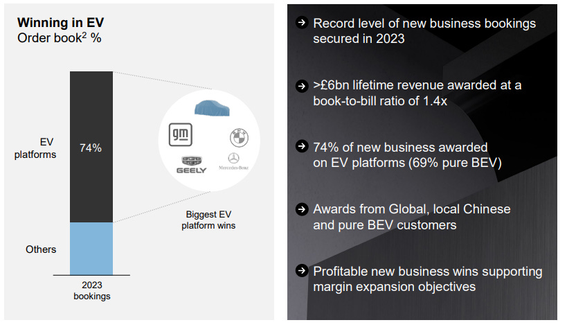 Specifically, it is expected that in 2026, the business mix will shift from 70%-30% to 80%-20%, mainly due to the increased weight of agnostic technology. At the end of 2023, they have already shown progress in this regard with an order book destined 74% for electric car platforms and 69% of these for 100% electric vehicles.