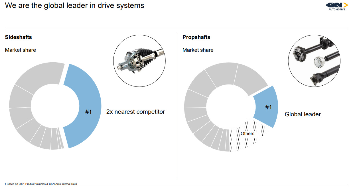 The company enjoys a leadership position in drive systems, where it stands out in its positioning in sideshafts (~40% global market share) and propshafts. Dowlais' positioning is quite strong, as it is estimated that the next competitor in sideshafts would have half of Dowlais' market share.