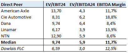 As can be seen, this comparison shows at least a 30% discount in Dowlais’ valuation if we take valuation through EV/EBIT as a reference.