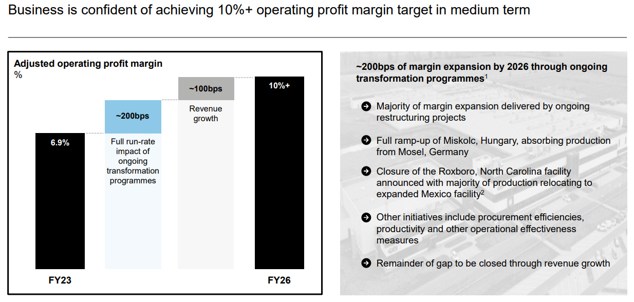 With all these initiatives, the company expects to increase margins by ~300 basis points and achieve an operating margin of over 10% in 2026 compared to pre-Covid levels of 7%. Of this improvement, 200 basis points would come from measures already undertaken, specifically: ramp-up of the new plant in Hungary, closure of the Roxboro plant in the US, and margin expansion due to restructuring undertaken.