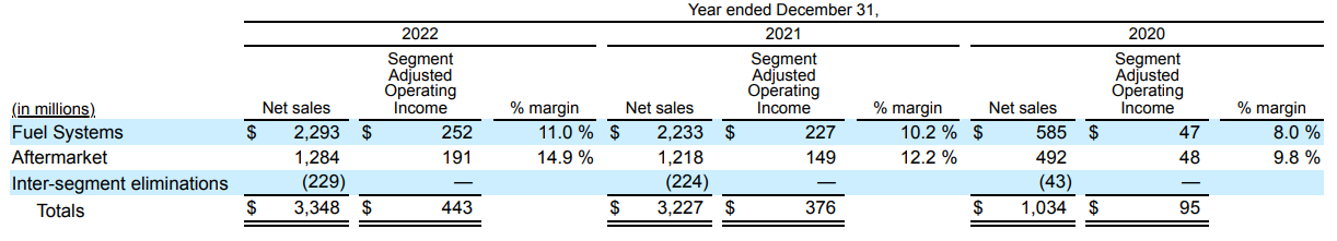 The Aftermarket segment generates a higher margin than the Fuel Systems segment. The following table presents the Net Sales and Adjusted Operating Income by segment: